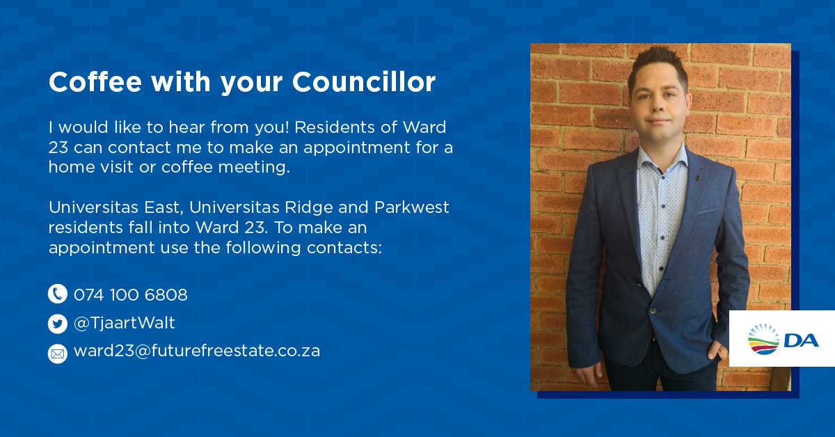 I invite any resident who is interested to have a virtual coffee meeting with me to contact me for an appointment to have a video chat via WhatsApp, Microsoft Teams, Zoom or other channels to discuss service delivery in our ward, Mangaung Metro affairs, planning and urban design issues or questions about the Democratic Alliance and our vision for South Africa