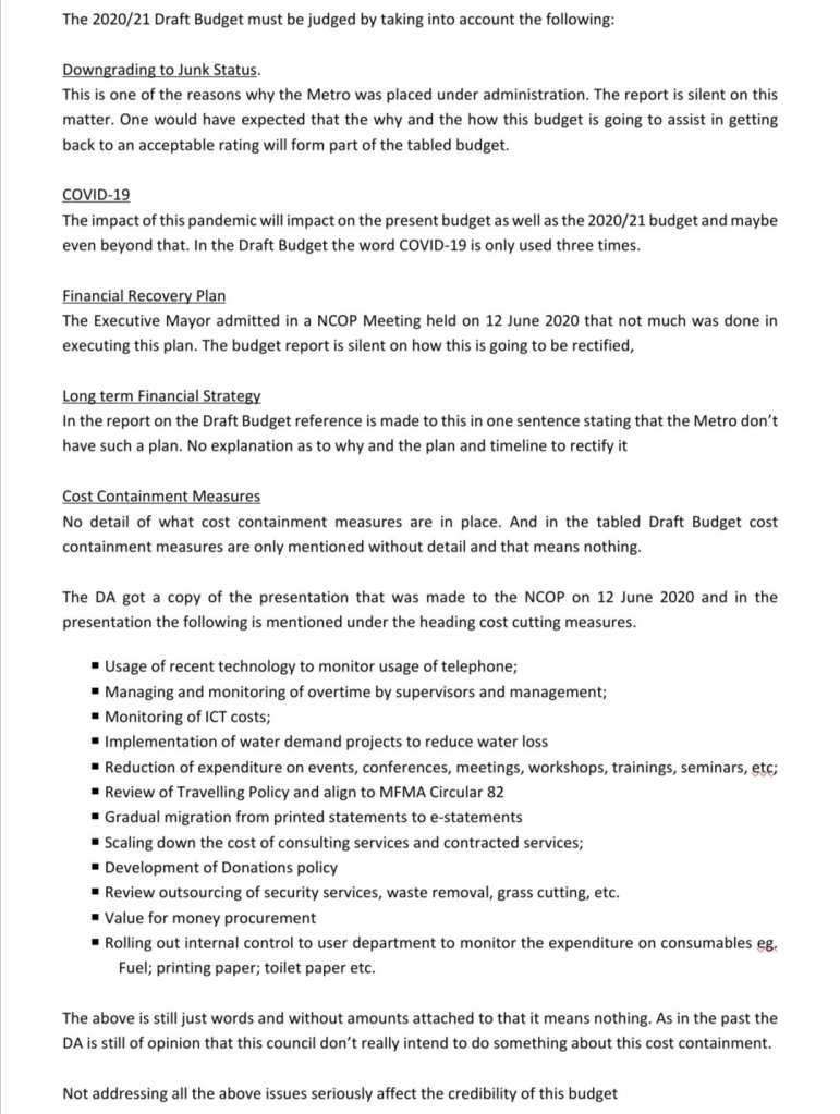 Credibility of the budget: The DA is of the opinion that the credibility of the budget will be seriously affected if the following issues are not properly addressed: Plans to counter and reverse the Downgrading to Junk Status, COVID-19 impact on the 2019/20, 2020/21 and further budgets, plans to ensure implementation of the Financial Recovery Plan, plans to rectify the lack of a Long term Financial Strategy and the financial implications of Cost Containment Measures and plans to ensure that the projects contained in the capital budget are executed within time and budgets.