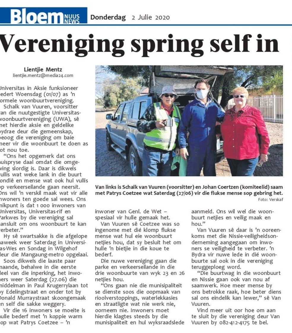 Universitas Neighbourhood Association Launches July 2, 2020 ~ Tjaart Van der Walt - DA Ward 23 Councillor Universitas Woonbuurt Vereniging het amptelik afgeskop Share this: Click to share on X (Opens in new window) X Click to share on Facebook (Opens in new window) Facebook Like Loading... Related Published by Tjaart Van der Walt - DA Ward 23 Councillor Information relevant to Ward 23, Mangaung and Free State Residents as well as DA News View all posts by Tjaart Van der Walt - DA Ward 23 Councillor