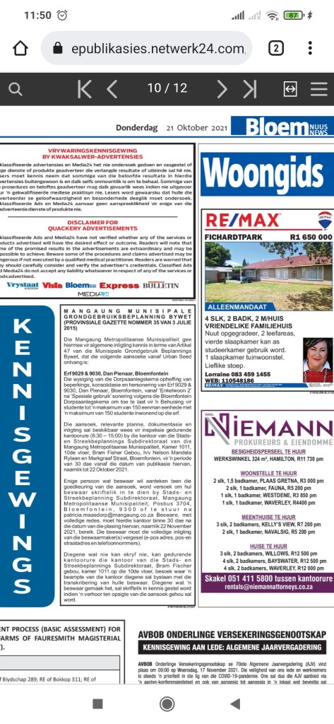 Neem kennis. Aansoek sê dan Pienaar, maar dis 28&30 Groenewoud, Universitas.